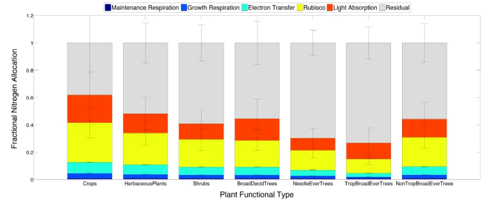 Nitrogen (N) is one of the most important nutrients for plant growth and a major constituent of proteins that regulate photosynthetic and respiratory processes. Motivated by the strong N limitations in high-latitude systems, we developed (Ghimire et al. 2017) a comprehensive analysis of N allocation in leaves for major processes and a wide range of plant functional types (PFTs). Using a wide range of observations, we determined PFT-specific allocation patterns of leaf N for photosynthesis (Rubisco, electron transport, light absorption) and respiration (growth and maintenance), and an unexplained “residual” N pool. Based on our analysis, crops partition the largest fraction of N to photosynthesis (57%) and respiration (5%) followed by herbaceous plants (44% and 4%). Tropical broadleaf evergreen trees partition the least to photosynthesis (25%) and respiration (2%) followed by needleleaf evergreen trees (28% and 3%). In trees (especially needleleaf evergreen and tropical broadleaf evergreen trees) a large fraction (70% and 73% respectively) of N was not explained by photosynthetic or respiratory functions. This large residual pool is hypothesized to emerge from larger investments in cell wall proteins, lipids, amino acids, nucleic acid, CO2 fixation proteins (other than Rubisco), secondary compounds, and other proteins. The resulting pattern of N allocation provides insights on mechanisms that operate at a cellular scale within leaves, and can be integrated with ecosystem models to derive emergent properties of ecosystem productivity at local, regional, and global scales.